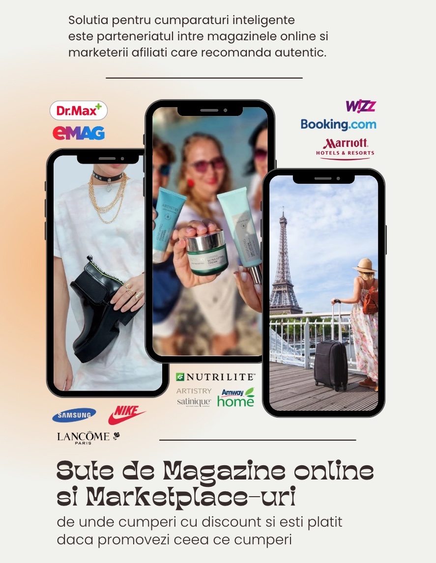 Biletele de avion sau cazarea la hoteluri, produsele de ingrijirea casei, suplimentele alimentare sau cosmeticele, chiar si uneltele digitale si cursurile care ma ajuta sa devin marketer afiliat le cumpar cu discount si imi genereaza venituri daca ma promovez online. Folosesc acelasi sistem ca al Danei.